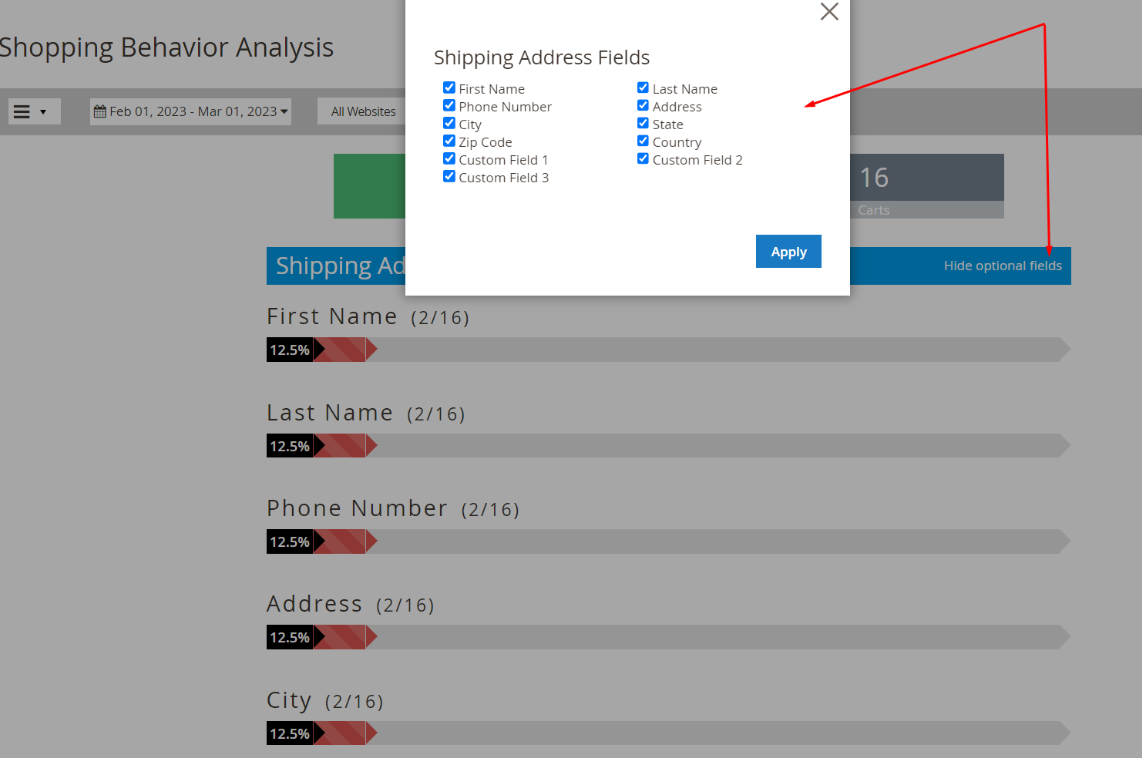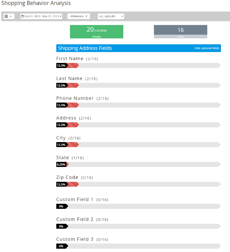 - Here is the percentage of times when fields were filled/updated on the checkout page before the cart was abandoned. This feature is compatible with One Step Checkout module, allowing stores to update custom fields as needed.