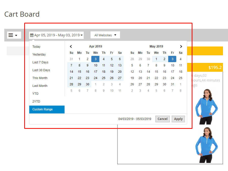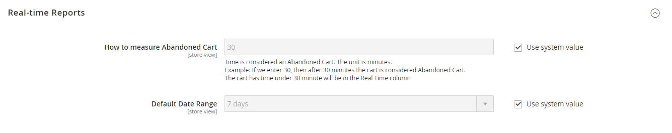 How to measure Abandoned Cart: Time to define an abandoned cart. The unit is minute. Example: If we enter 30, then after 30 minutes, carts will be considered abandoned. The carts under 30 minutes will be in the Real Time column. Default Date Range: Day limit on Cart Board Page