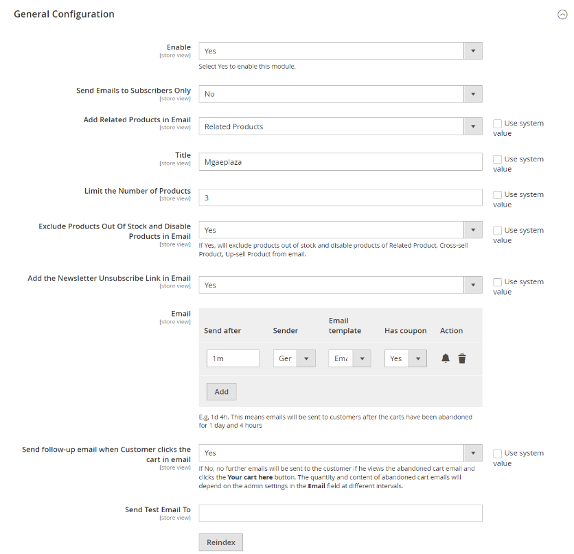 - Enabled: select “Yes” to enable Mageplaza Abandoned Cart Email extension