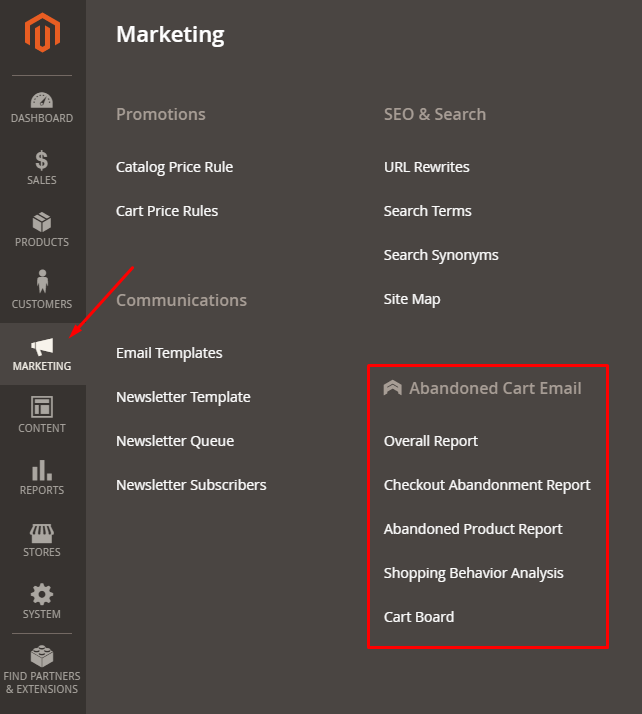 From Admin Panel, select Marketing > Abandoned Cart Email > Shopping Behavior Analysis