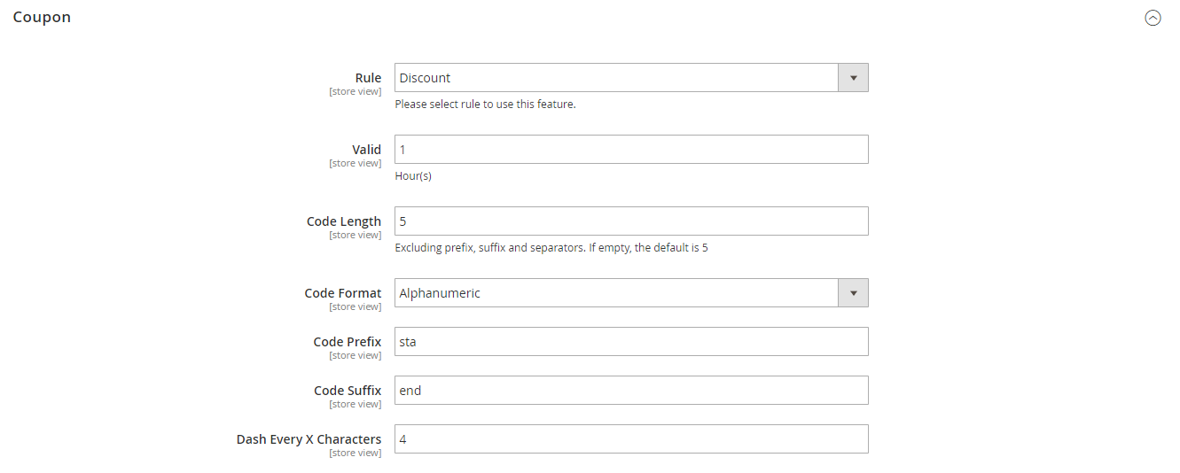 - In the Code Length field: set the length of discount code. Code length does not include Prefixes, Suffixes, and Separators
