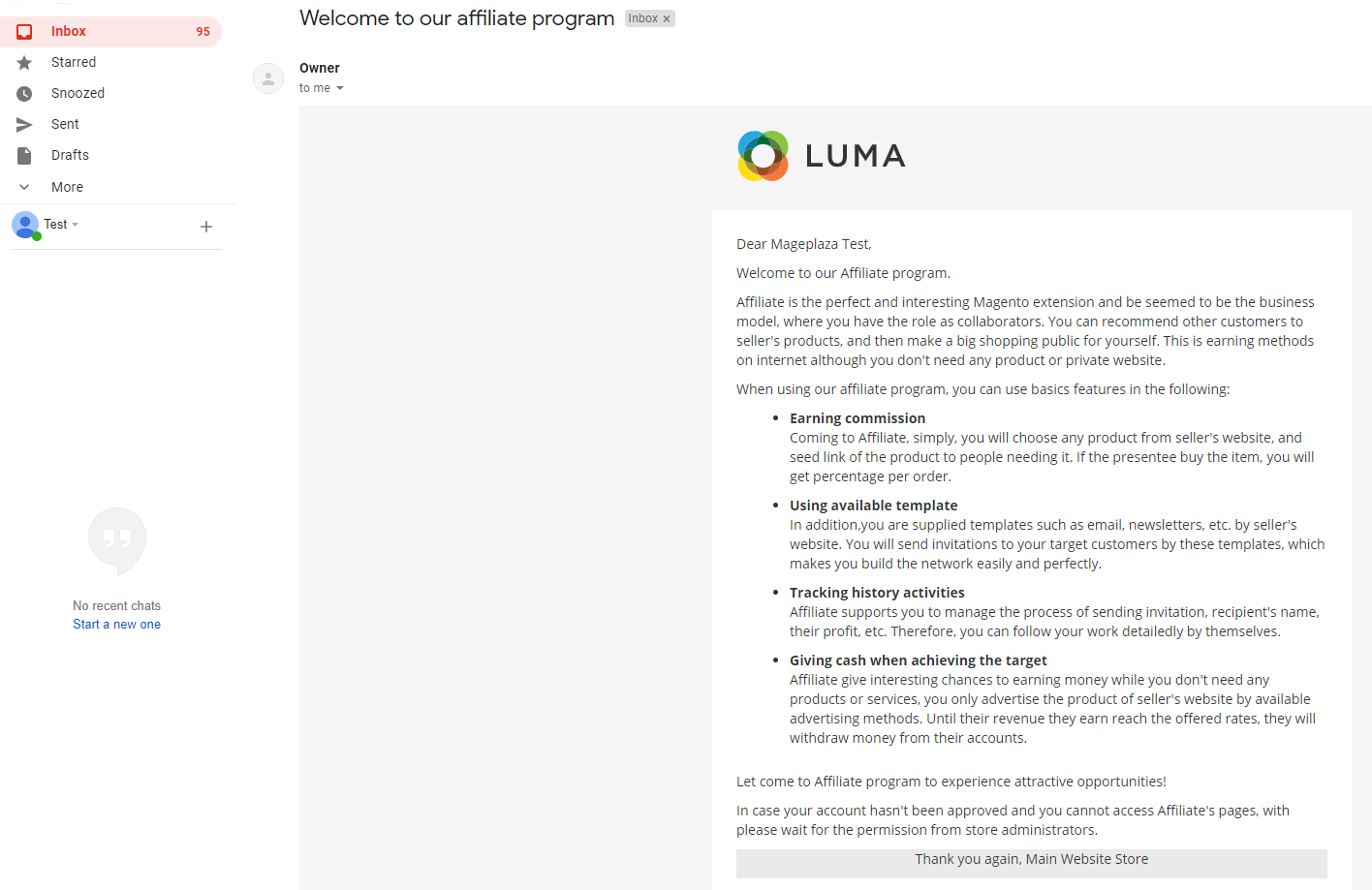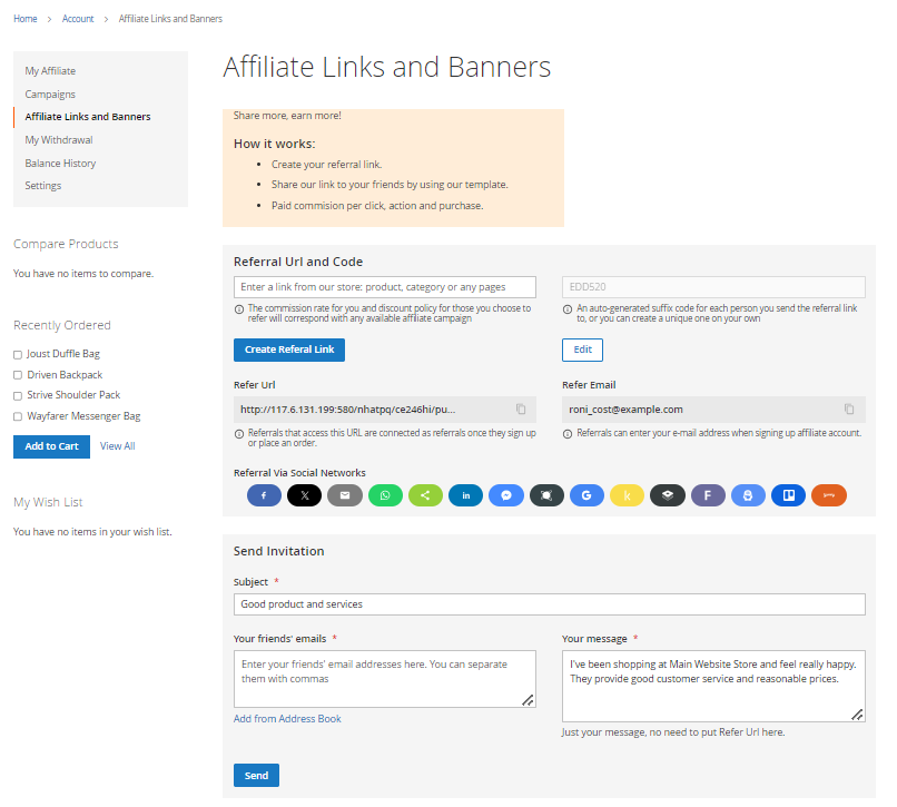 Affiliate module by Mageplaza allows affiliates to refer friends via referral URL, code and email.