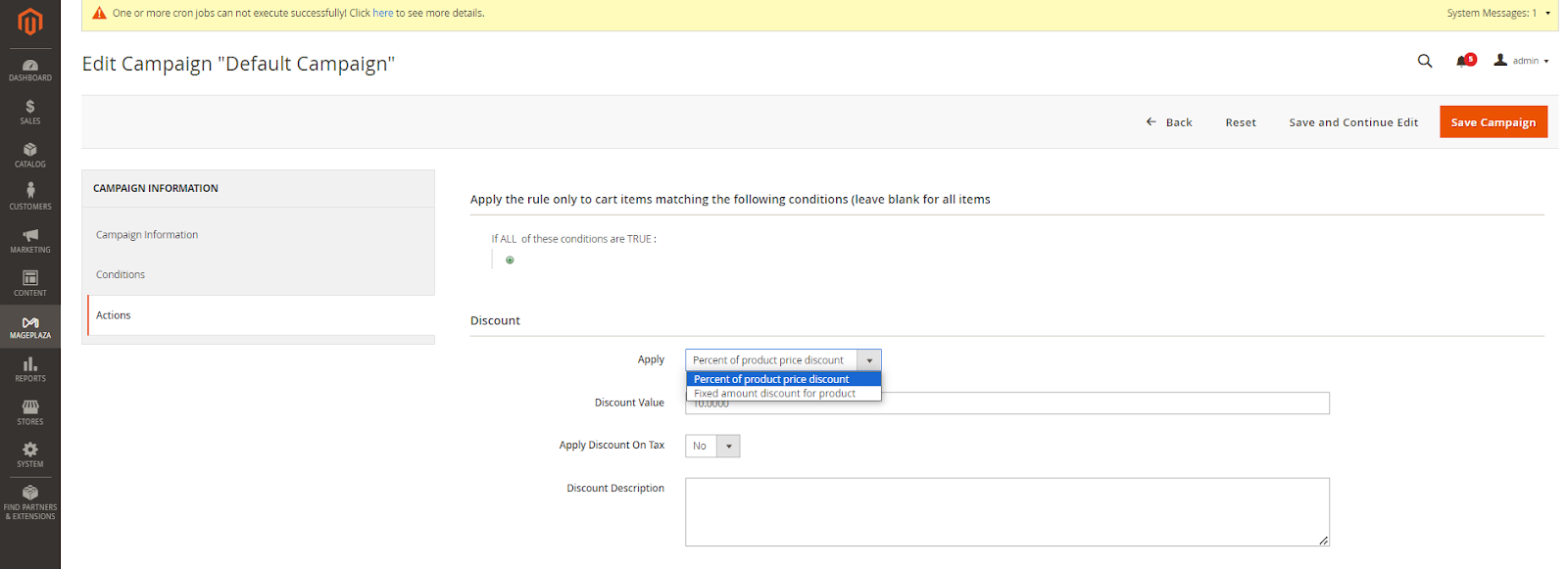 - Apply = Percent of product price discount: Apply discount for the percentage of each product price