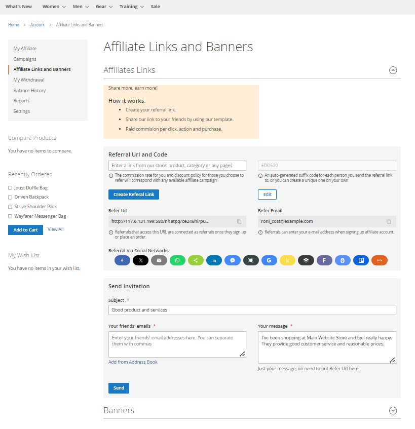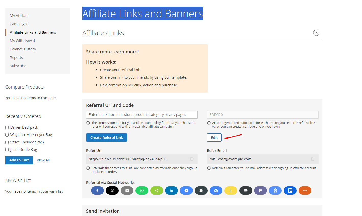 Just insert friends' email addresses together with a message to send invitations instantly on the Affiliate Links and Banners page. Besides that, they can edit the Referral Code or share Referal URL via social media.