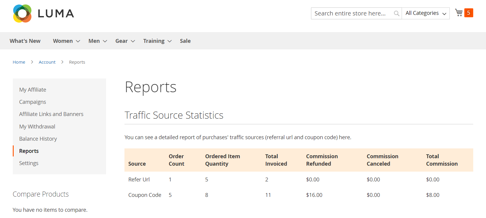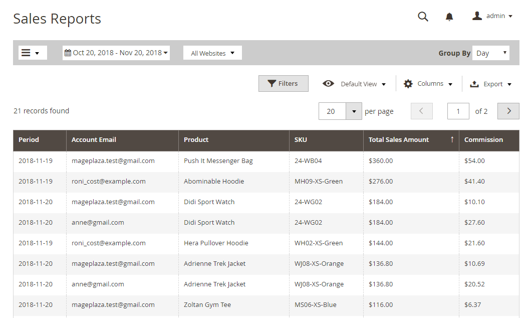 In this field, admins can view the sales and the commission of related Affiliate accounts by date. This module allows for the filtering of some available filter options in Magento. The admin can also filter by store, day, week, month, and year easily.