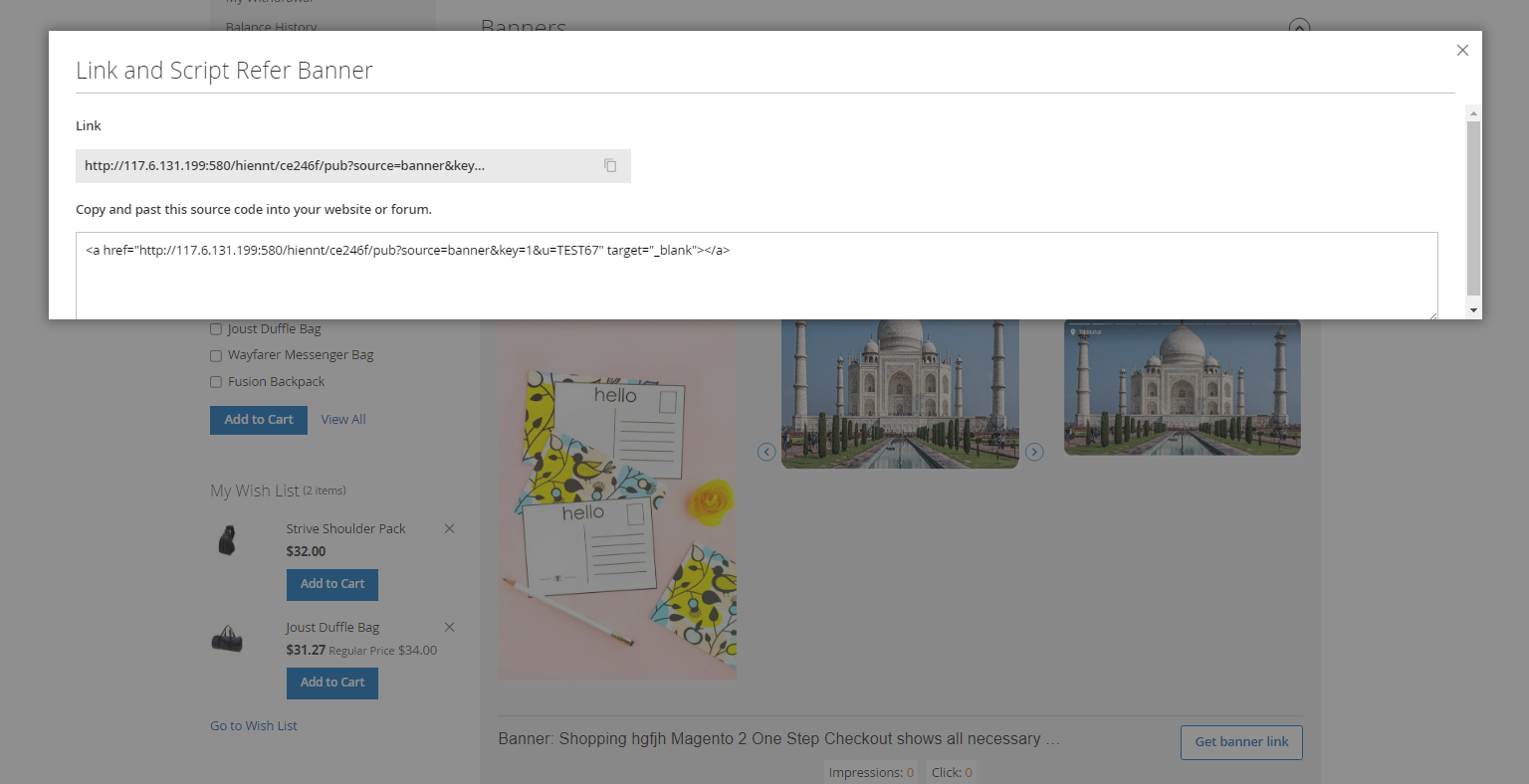 When clicking on “Get Banner link”, the HTML and Banner Link will show as below: