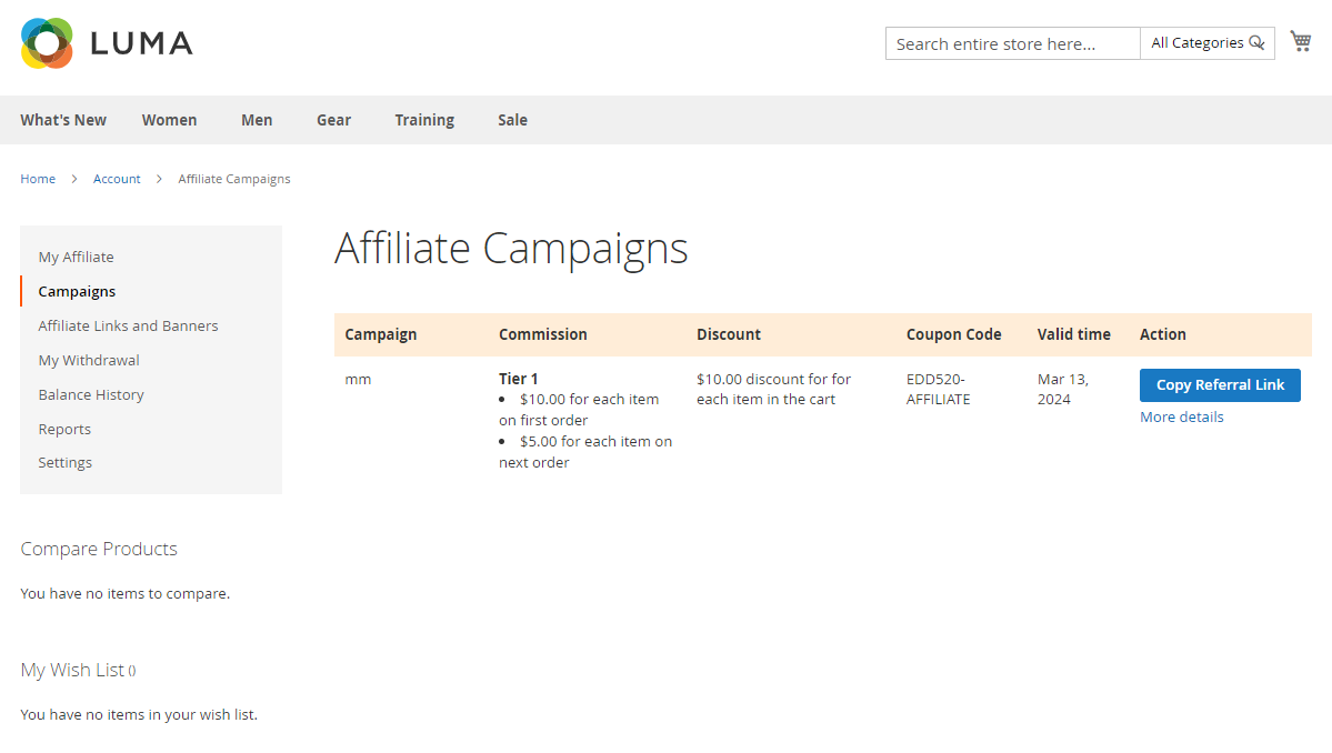 Campaigns, Commission, Discount, Coupon Code, Valid Time, Copy Referral Link button, and More Details will be shown here: