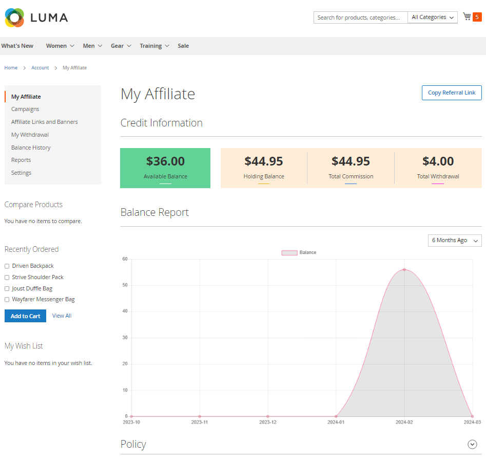 Affiliate module by Mageplaza allows affiliates to refer friends via referral URL, code and email.