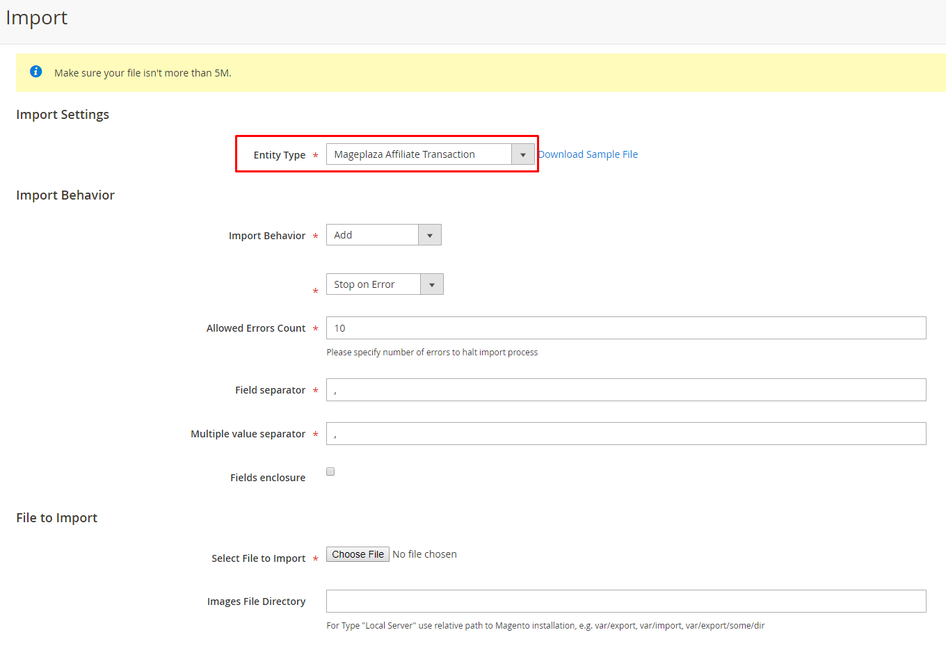 Step 3: Upload the import file from your computer. If you do not know what the file format is and which data to insert, please click on Download Sample File to see the example.