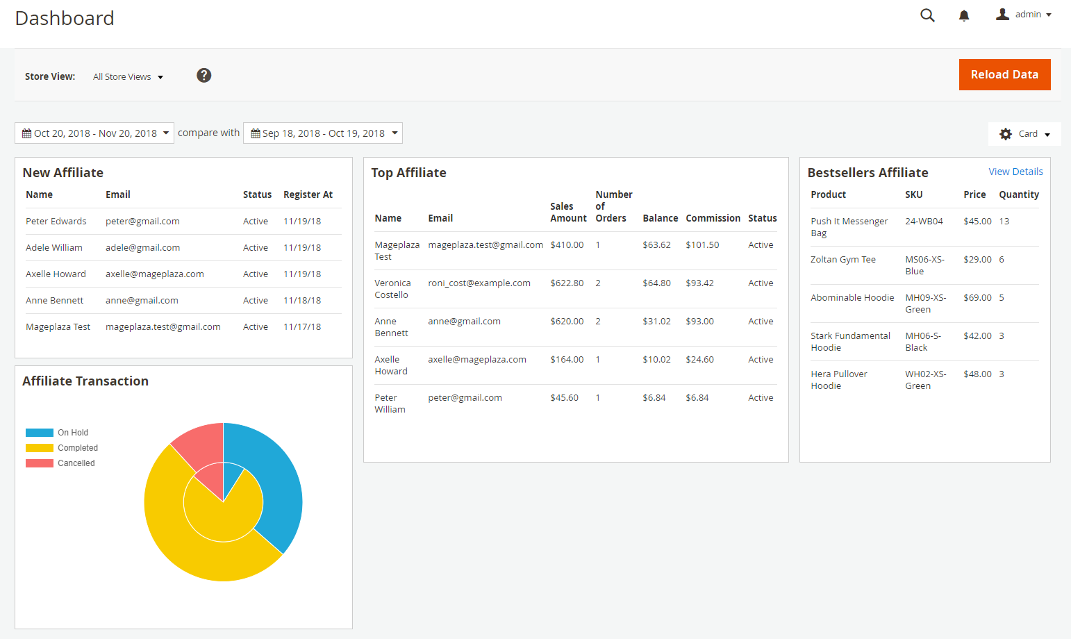 - This card records all the affiliate transactions with three statuses: On Hold, Completed, and Cancelled. It will be shown in a Pie chart for better visualization.