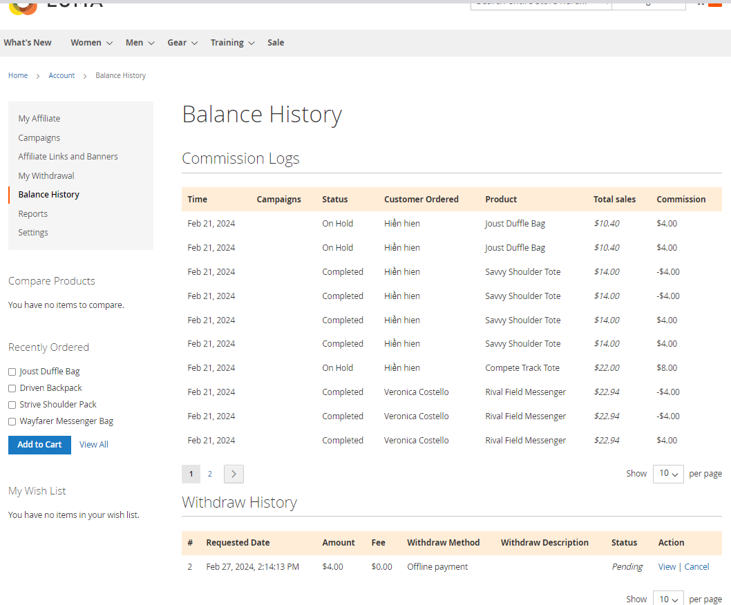Affiliate allows you to check Commission Logs with detailed information about the affiliate account's commission receipt, including time, campaigns, status, customer orders, product, total sales, and commission. Besides that, the Withdraw History is also displayed to record affiliate account withdrawal details (Amount, Fee, Withdraw Method, Withdraw Description, Status, and so on).