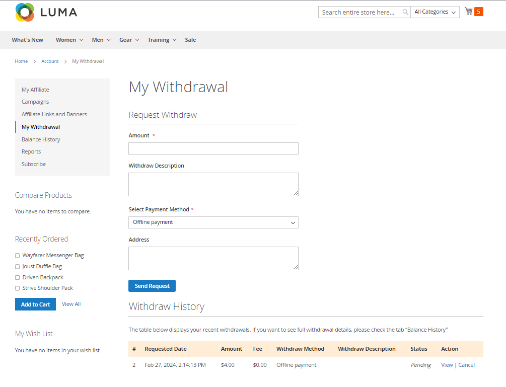 Mageplaza Affiliate supports offline payment and PayPal payment for the withdrawal. You can check the 10 most recent withdrawals. Each created withdrawal will be saved and managed in Withdraw History. Let's follow its status to know where the request is in progress.