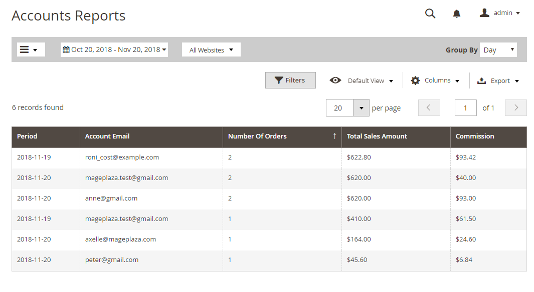 In this field, admins can view the sales and the commission of related Affiliate accounts by date. This module allows for the filtering of some available filter options in Magento. The admin can also filter by store, day, week, month, and year easily.