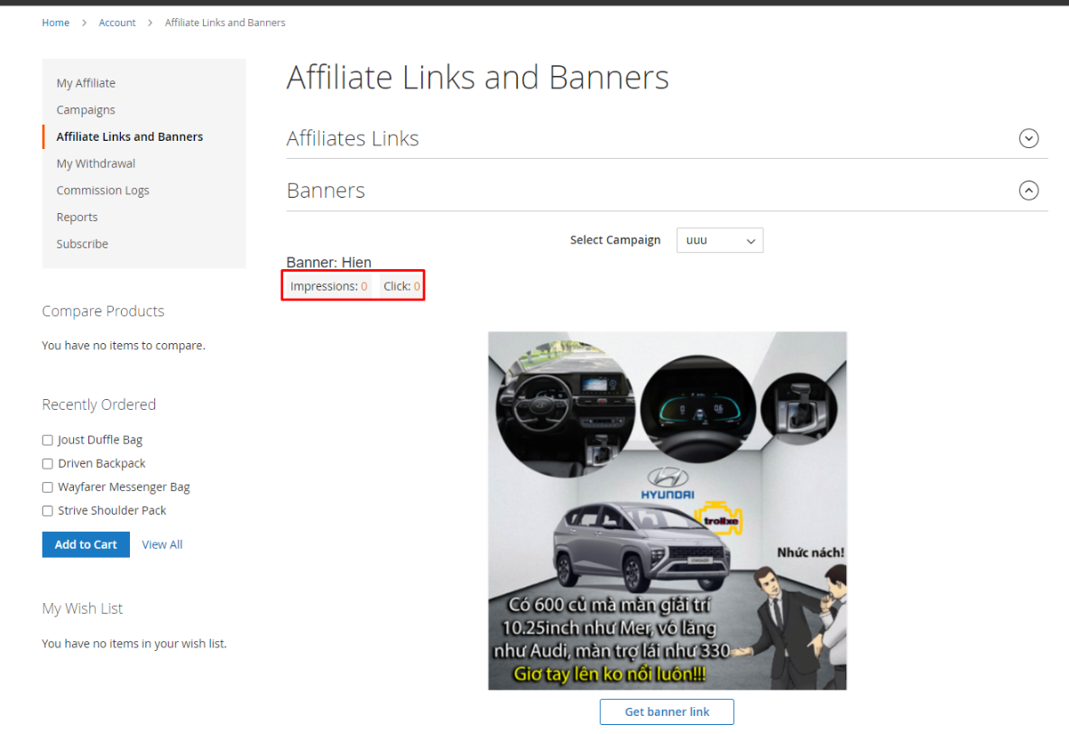 | 5 | Track affiliate program performance in detail | The integrated banner reporting module provides detailed click and impression data for each banner. Based on this important information, store administrators can access banner performance while affiliates can optimize advertising strategies. With data-driven insights, users can increase click-through rates and improve the overall success of their affiliate program. Store owners can check all data related to affiliate actions through program reports. With this feature, store owners can know everything at regular intervals, including best-selling products, affiliate accounts, and sales. |