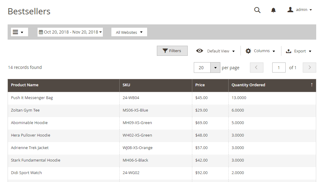 This field allows for the showing of information for seller products, including name, SKU, price, and number of products sold. Admin cannot only filter the products by Magento default, but they can also filter by store data and by date with ease.
