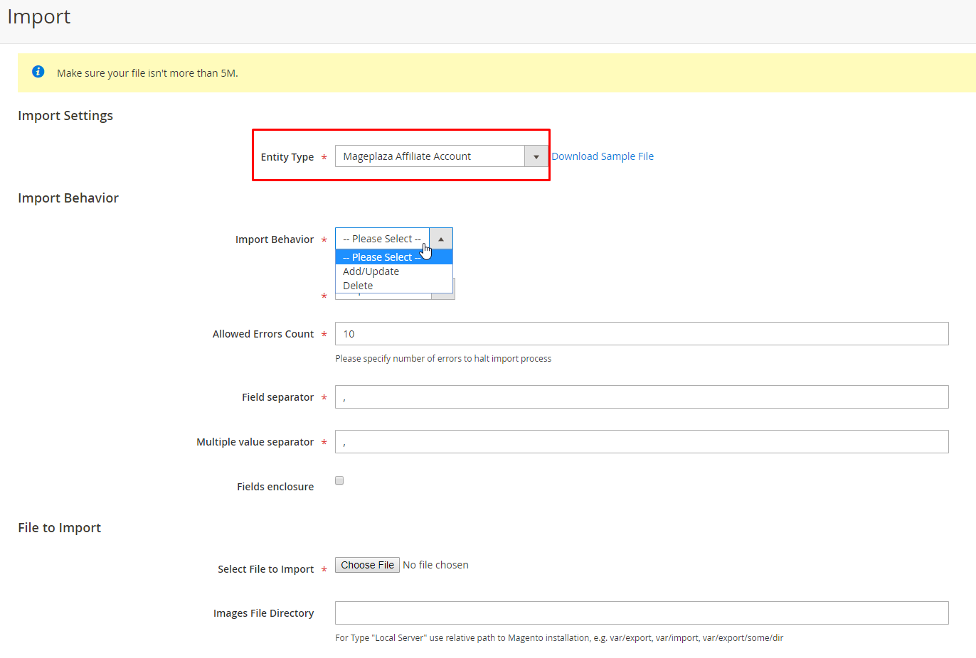 Step 2: Select Import behavior: You can Add/Update or Delete account