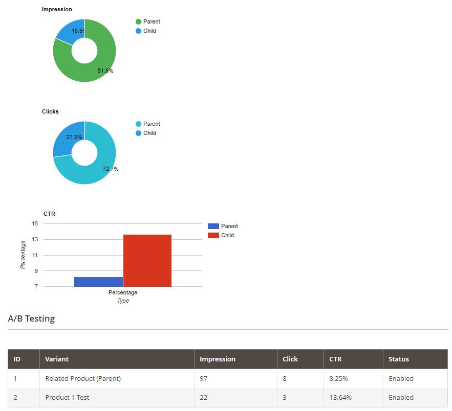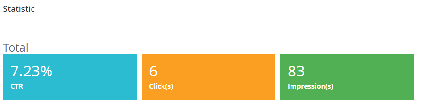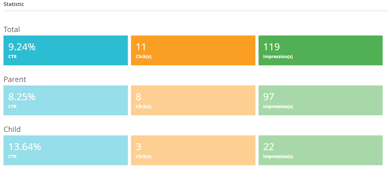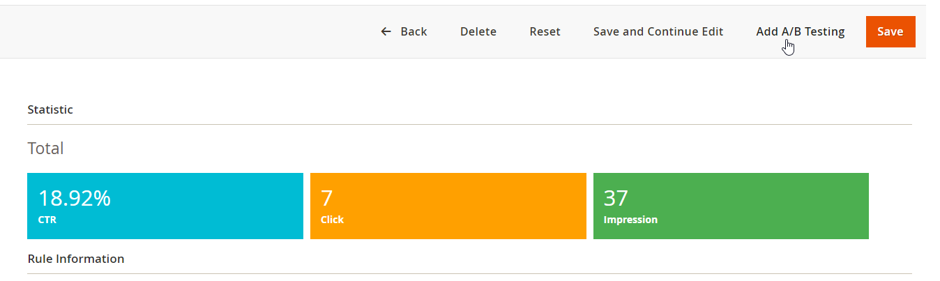After the A/B Testing Rule is created, the Statistic section will be changed to sum up the views, clicks, and CTR rates of two rules.