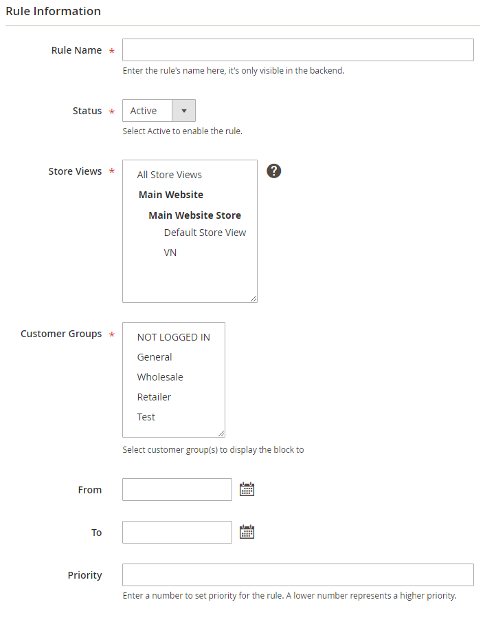 All fields are similar to those in the Rule Inforamtion on Product Page. You can check them on the section 2.