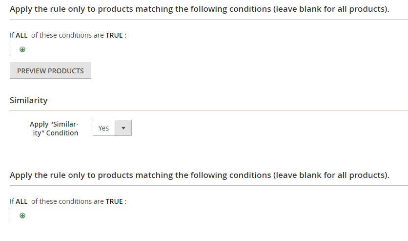 Apply "Similarity" Condition = Yes: Allow showing products having products attributes that are similar to the product on the current product page. Product attributes are selected via conditions. Similarity is available only on product pages.