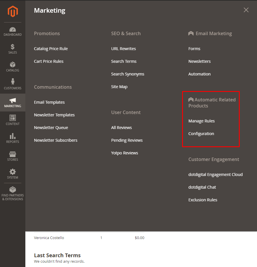 Login to Magento Admin, choose Marketing > Automatic Related Products