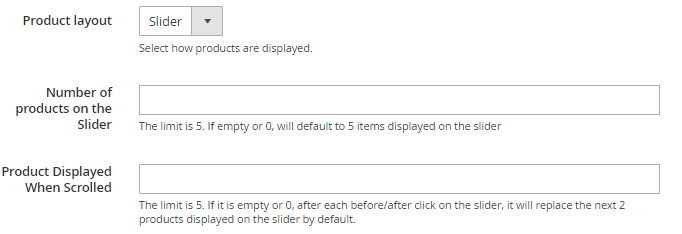 Product Displayed When Scrolled: Type in the number of products you want to show each time the slider moves. The limit is 5. If empty or 0, after each before/after click on the slider, it will replace the next 2 products displayed on the slider by default.