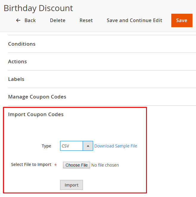 - If you do not know how to create a coupon code list in a CSV file, you can click on the Download Sample File link to download the sample file.