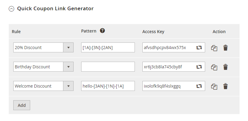 The created coupon link is similar to The quick coupon link, every time the page is refreshed, a new coupon following the [12AN] pattern will be generated. Enter the rule ID to decide which rule that coupon code is based on. You can choose key from Access Keyto decide its rule and pattern.