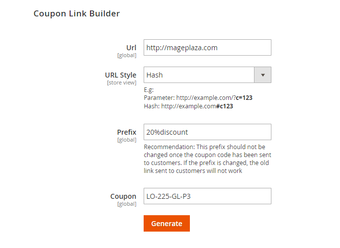 - Don't forget saving config and clear cache after changing prefix. Othewise, the coupon link cannot be valid.