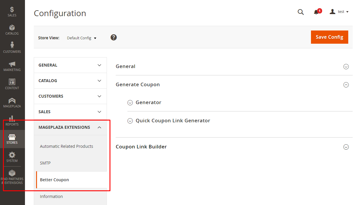 From the Admin Panel, go to Store > Settings > Configuration > Mageplaza Extensions: Better Coupon