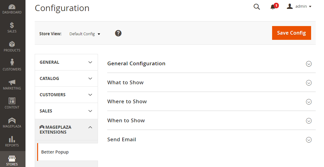 Log into the Admin Panel, go to Store > Settings > Configuration > Mageplaza Extensions > Better Popup