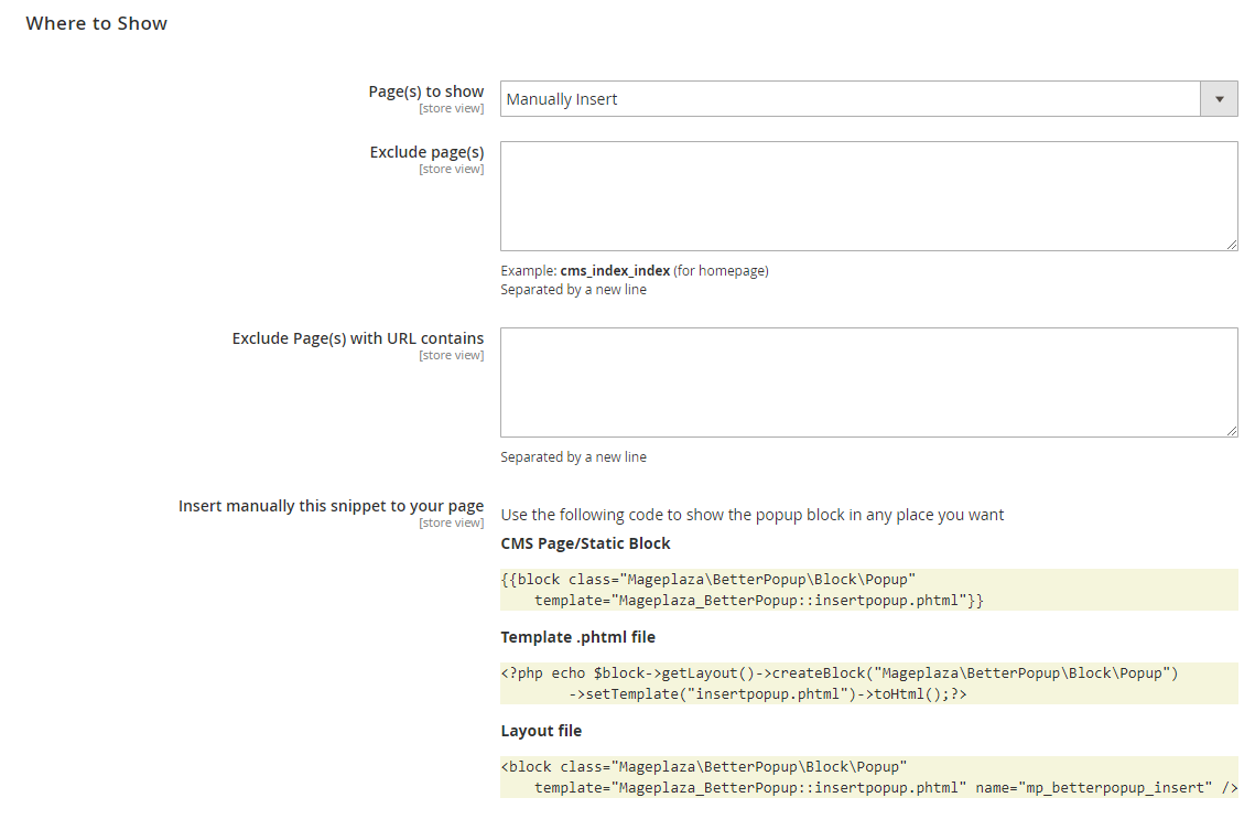 - Page(s) to show = Manually Insert: Show the popup on the pages that are inserted the code at the Manually Insert.