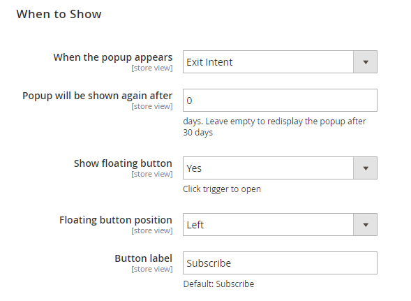 - When the popup appears = Exit Intent: This means that the popup will appear when hovering away from the current page. It does not support Exit Intent Popup on Mobile.