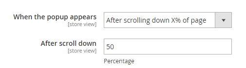 When the popup appears = After scrolling down X% of page: The popup will appear when scrolling the page down x% configured