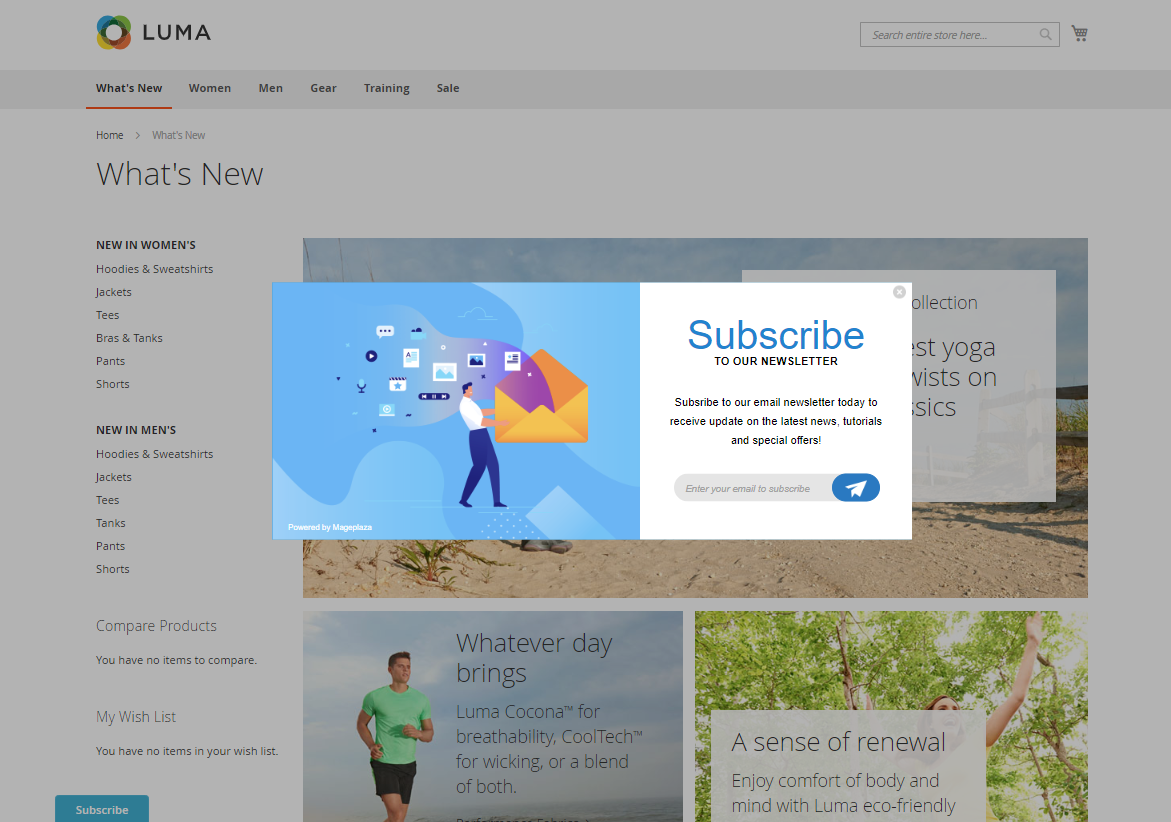 - When you enter in this field: /gear/bags, /women/tops-women/jackets-women, the popup will display on the pages containing the URL above.