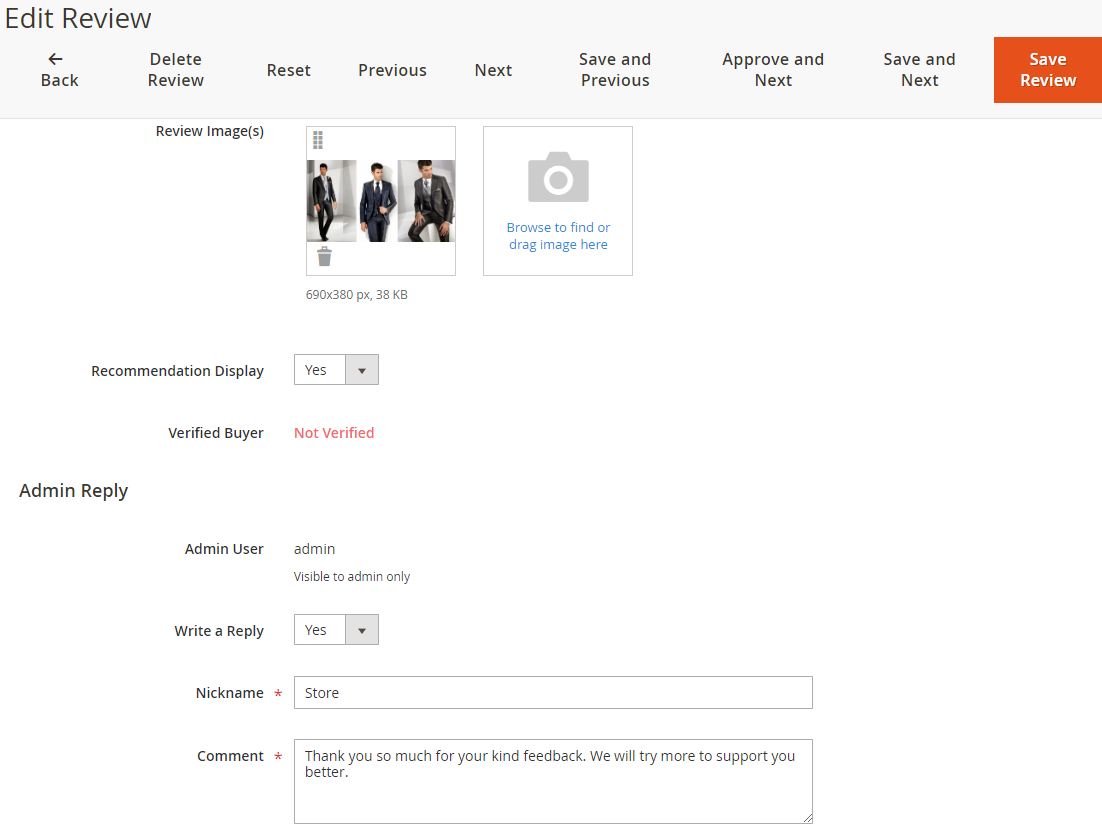 When admin edit 1 review, in addition to the available Magento fields, the Mageplaza Better Product Reviews module also adds some other useful fields.