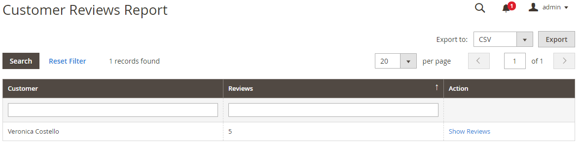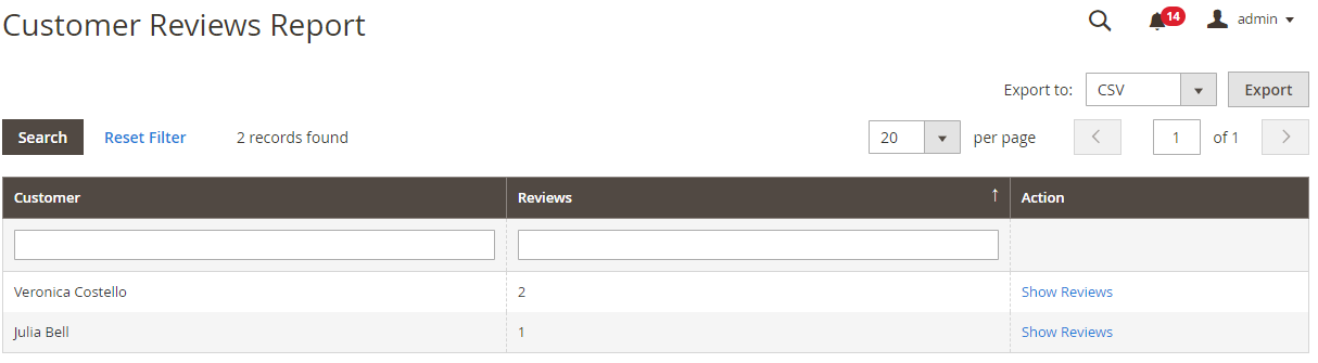 Customer reviews are listed according to Report Review Status which has been installed at Configuration. With each status selected, the report will be different
