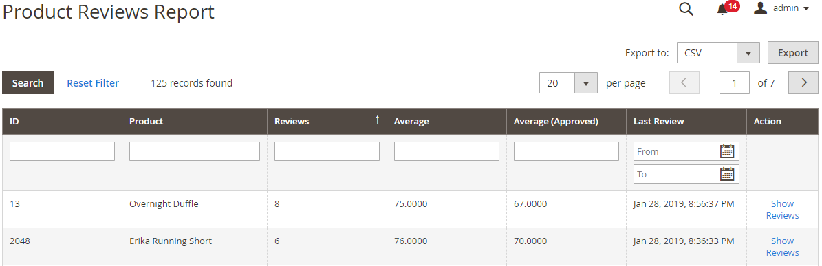 Product reviews are listed according to Report Review Status installed at Configuration. With each status selected, the report will be different