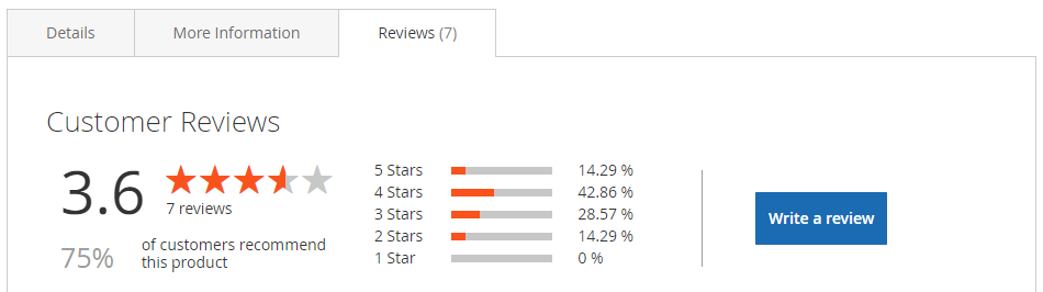 Yesto display the Review Summary at the Review tab of the Product Detail Page - Review Summary includes: review number, average number of stars, recommend percentage, rating star chart