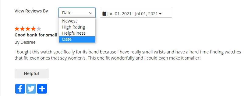- Reorder the reviews to show the Newest Review, High Rating, Helpfulness reviews and Date