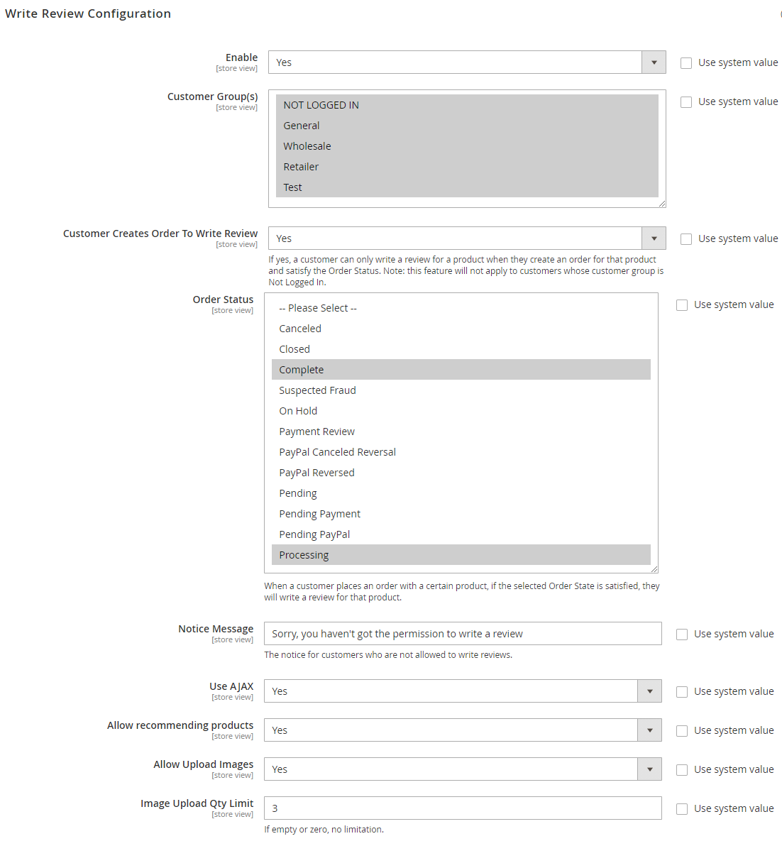 - Customer Create Order To Write Review: If Yes, a customer can only write a review for a product when they create an order for that product and satisfy the Order Status. Note: this feature will not apply to customers whose customer group is Not Logged In.