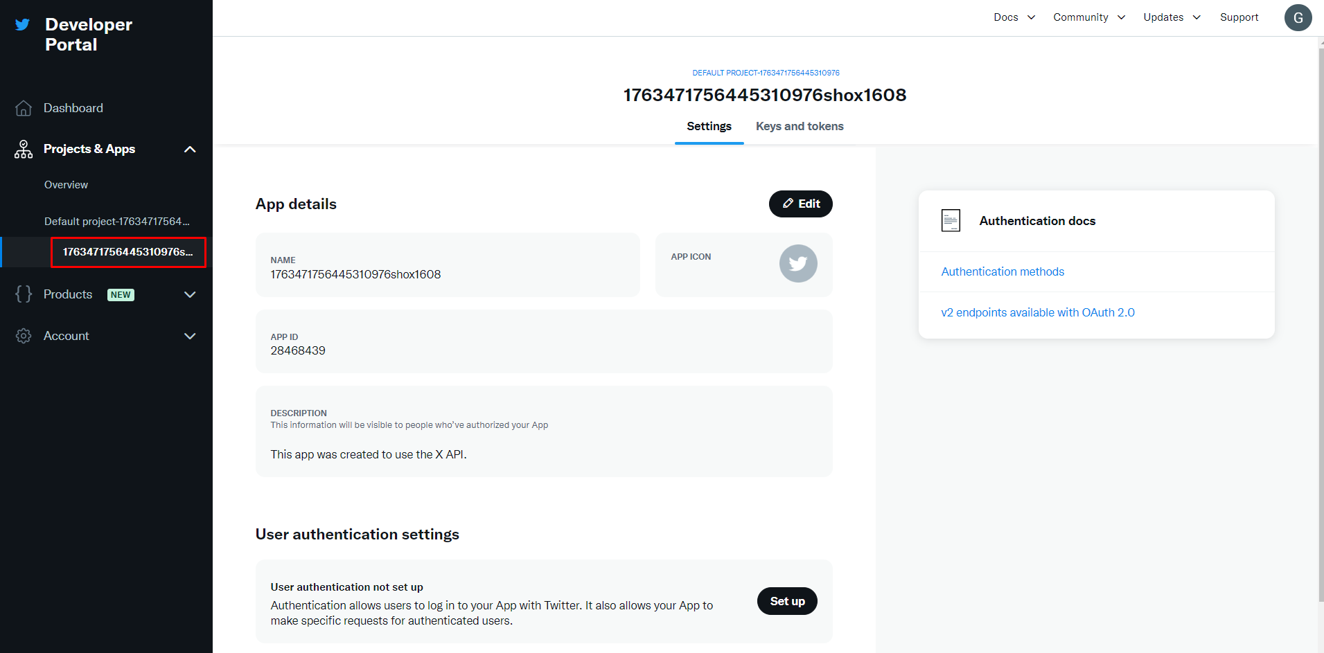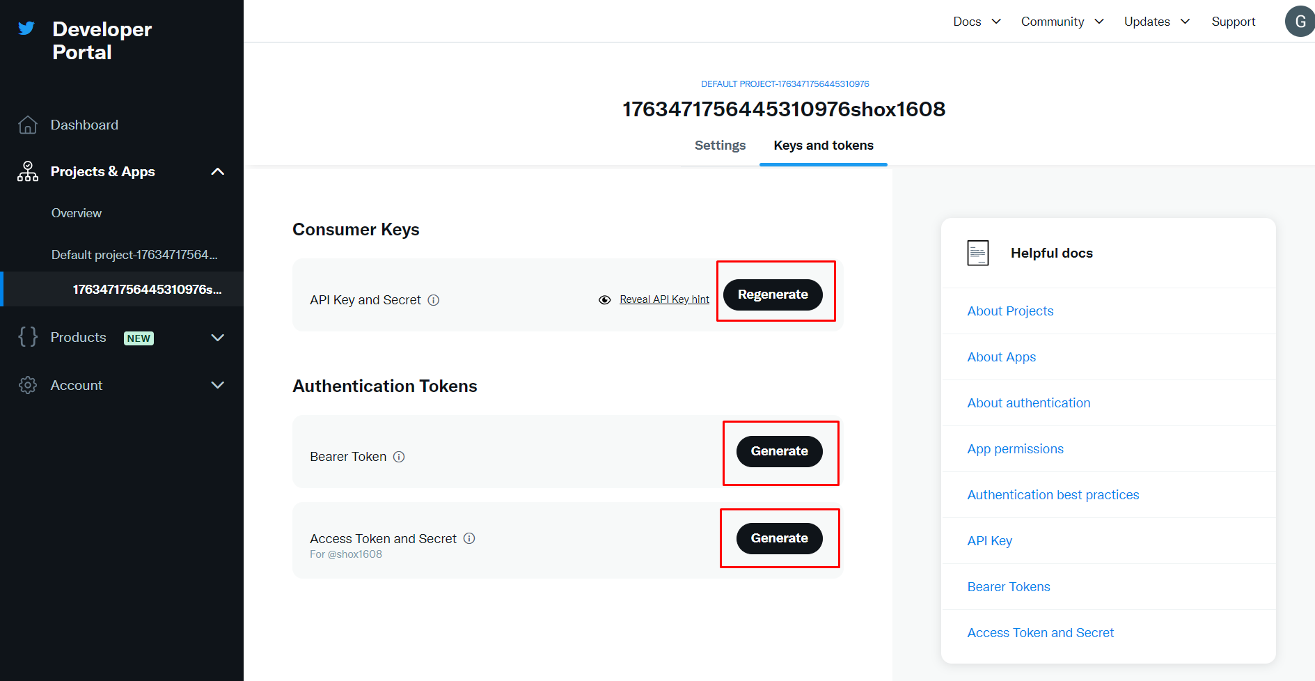 To obtain the key, go back to the previous page, select the Keys and Token tab > click Generate in the sections labeled API Key and Secret, Bearer Token, Access Token, and Secret.