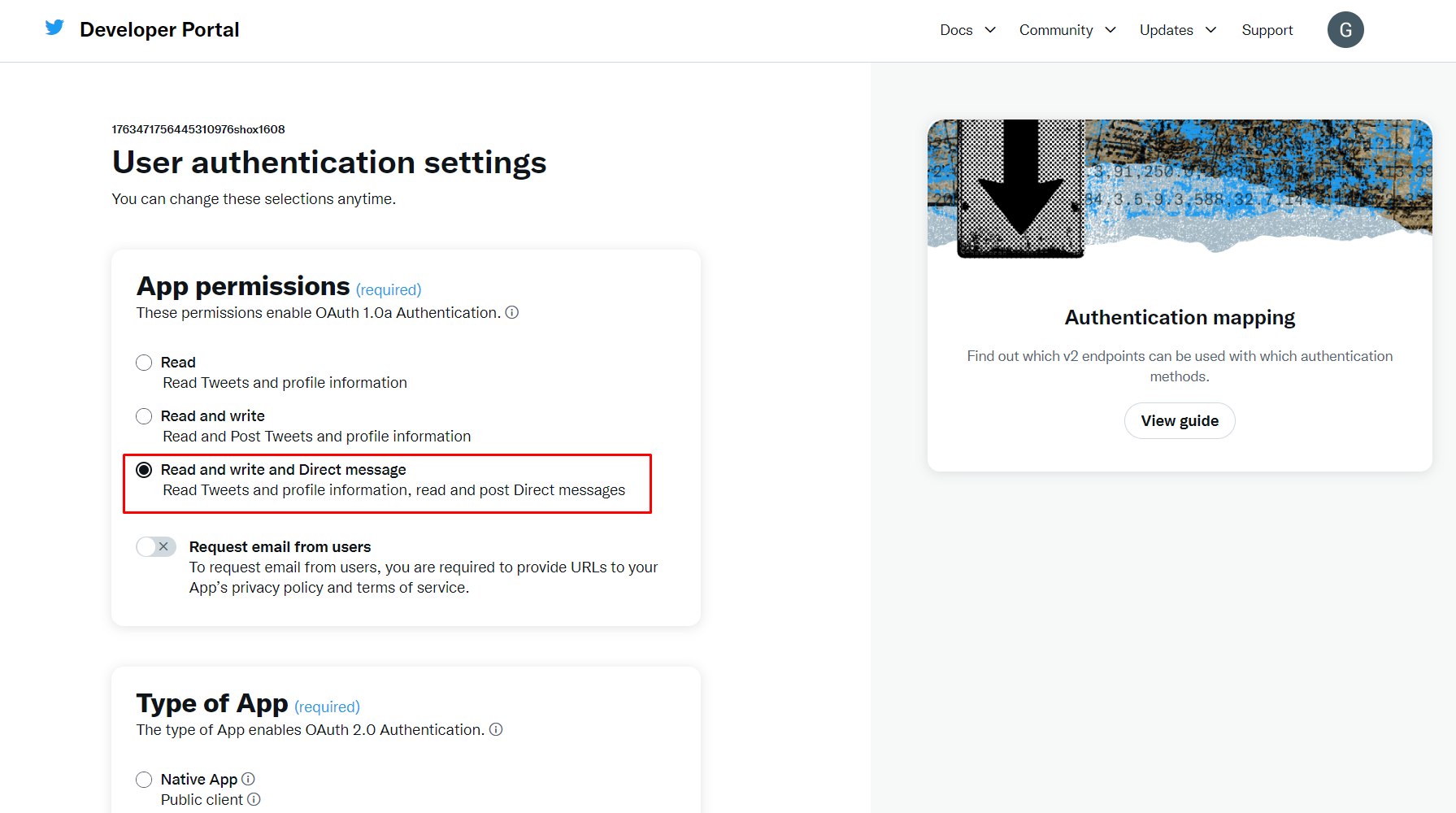 To give the application full permissions, go to the Settings tab > User Authentication Settings > click Setup > choose Read and write and Direct message.