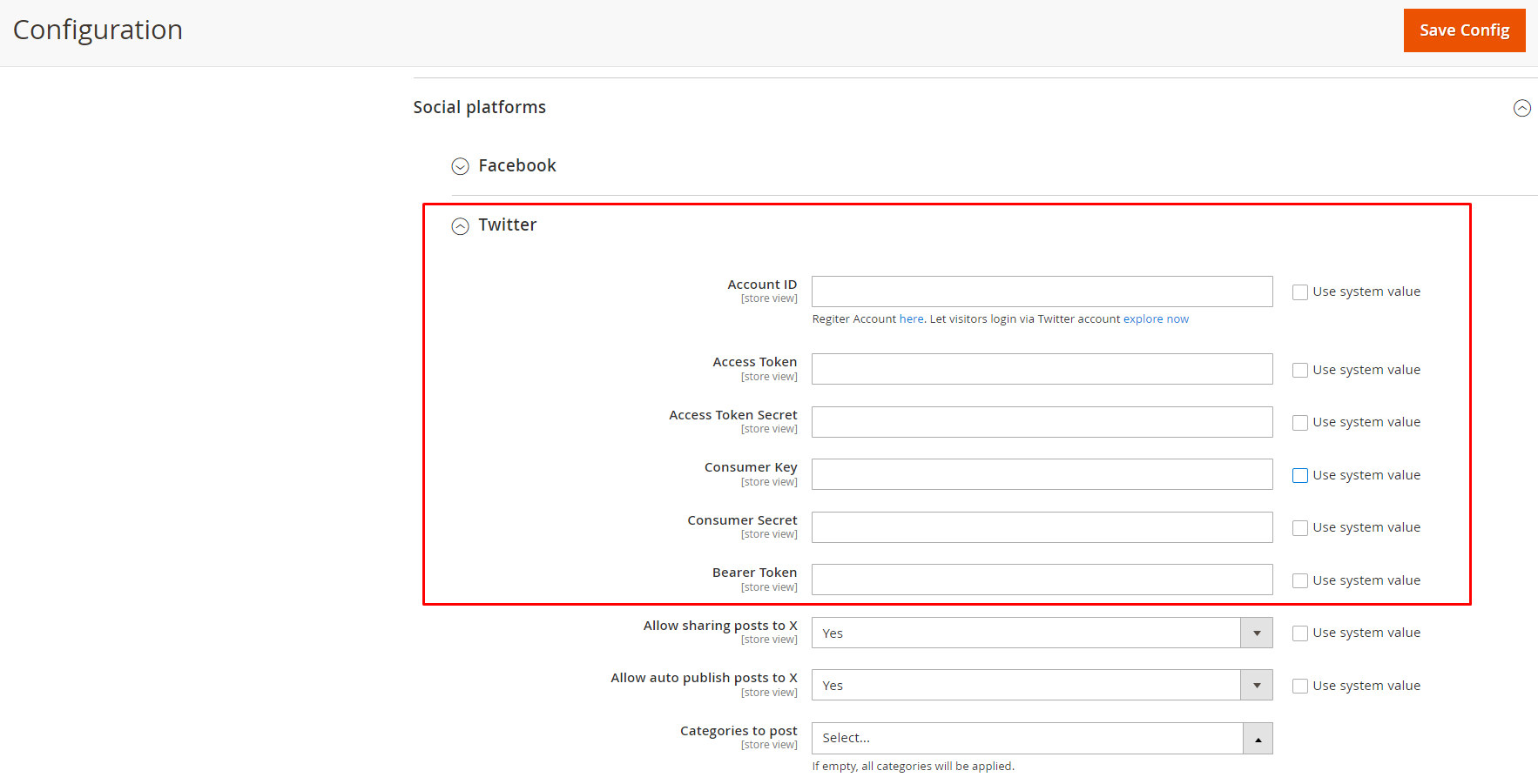 In Backend Config Magento Admin > Configuration > Blog Pro > Social Platform > Twitter, copy and paste the keys acquired in Step 4.
