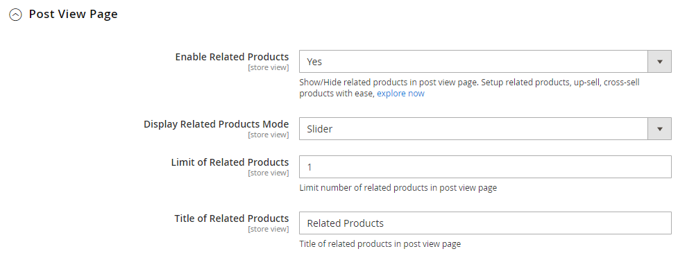 - In the Display Related Products Mode field: Set the Related Post at Post View Page shown in grid or slider.