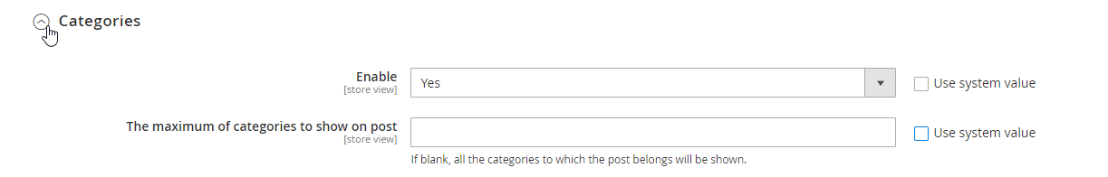 - The maximum of categories to show on post: Enter a number to restrict the amount of Categories shown on the sidebar. All categories with posts will be shown if left empty.