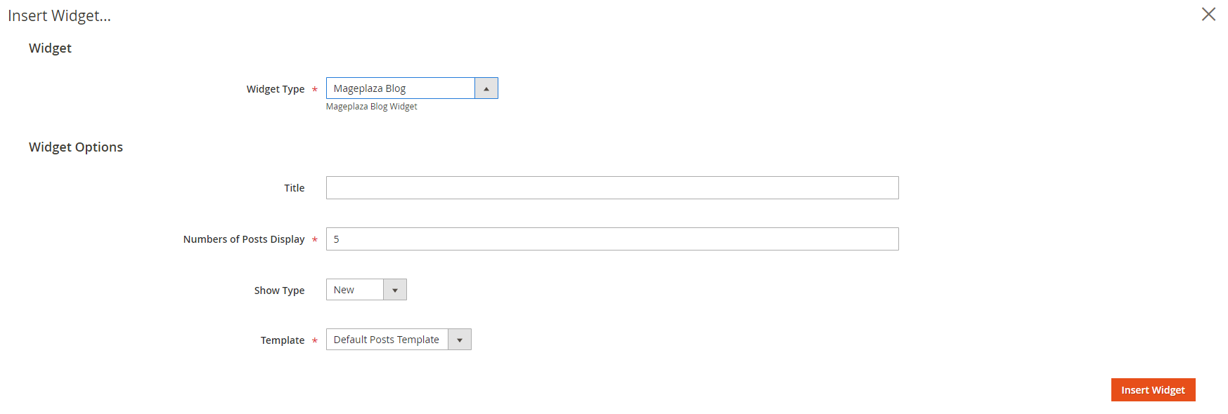 Mageplaza Blogto use this widget for adding posts in the content of any optional pages.