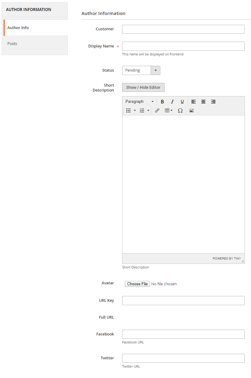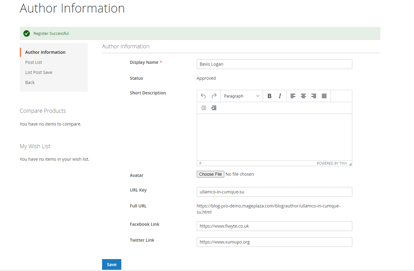 - URL Key: Enter the URL Key that the visitor can access the list post of author