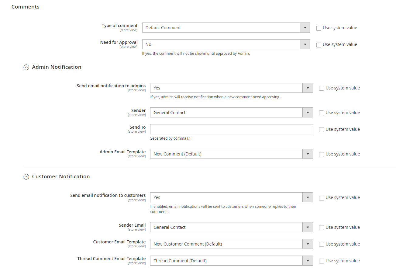 - Send email notification to customers: Select “Yes” so that authors will receive email notifications whenever there are new comments on their articles, and consumers will receive notifications when someone responds to their comments.