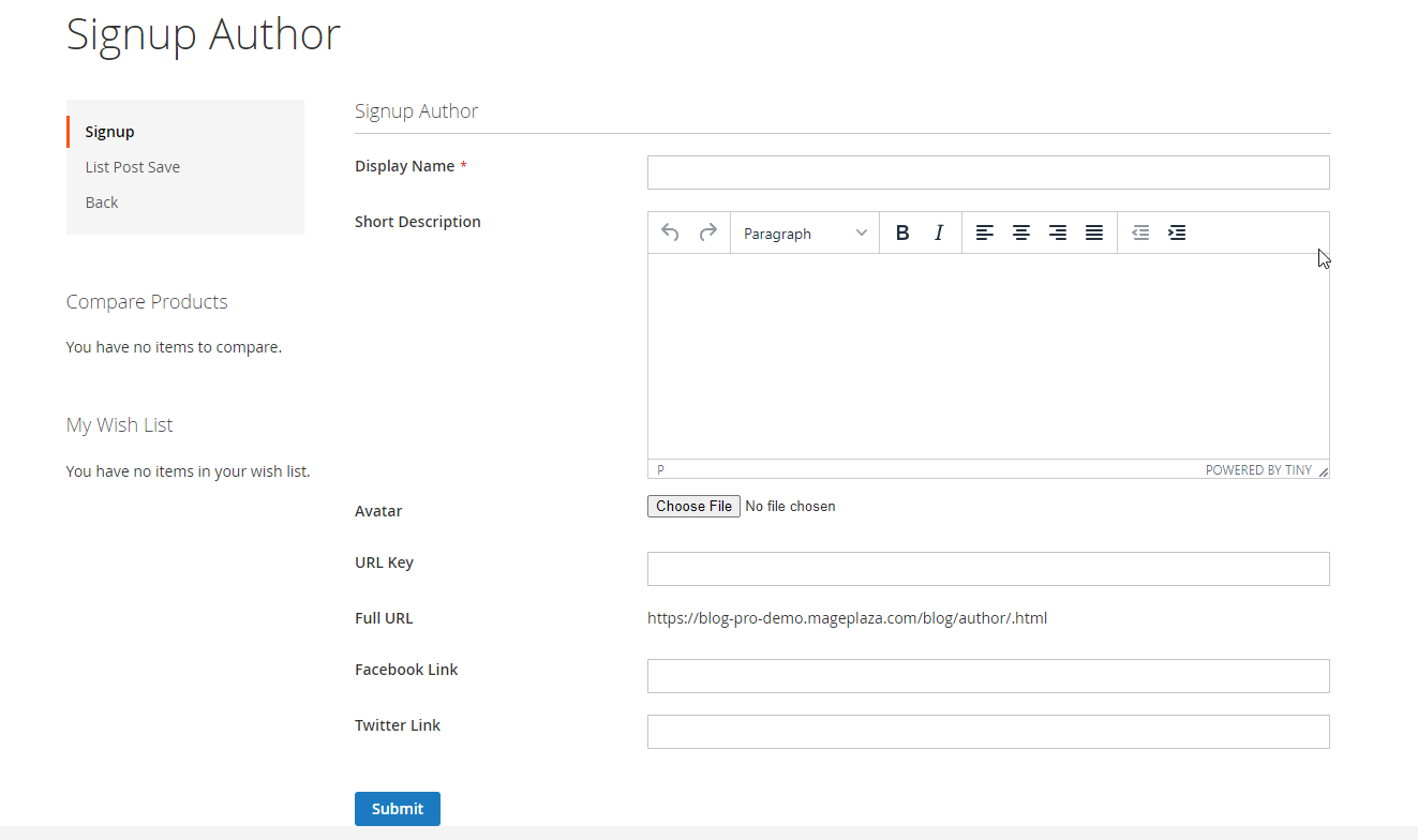 - Go to My account > My Better Blog, here you will see the Signup Author, complete the fields in the registration form then click Submit button to complete the registration