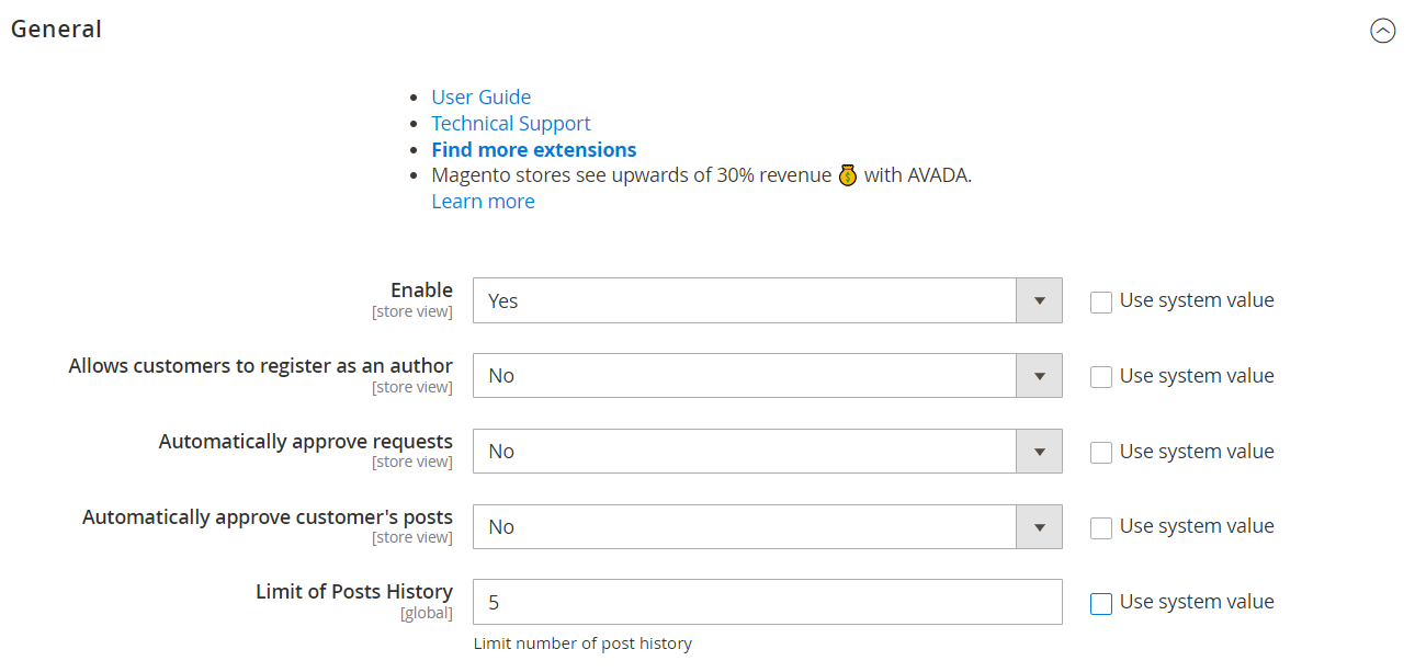 - Automatically approve customer's posts: Select Yes to allow auto-approving customer posts when creating new posts outside the frontend